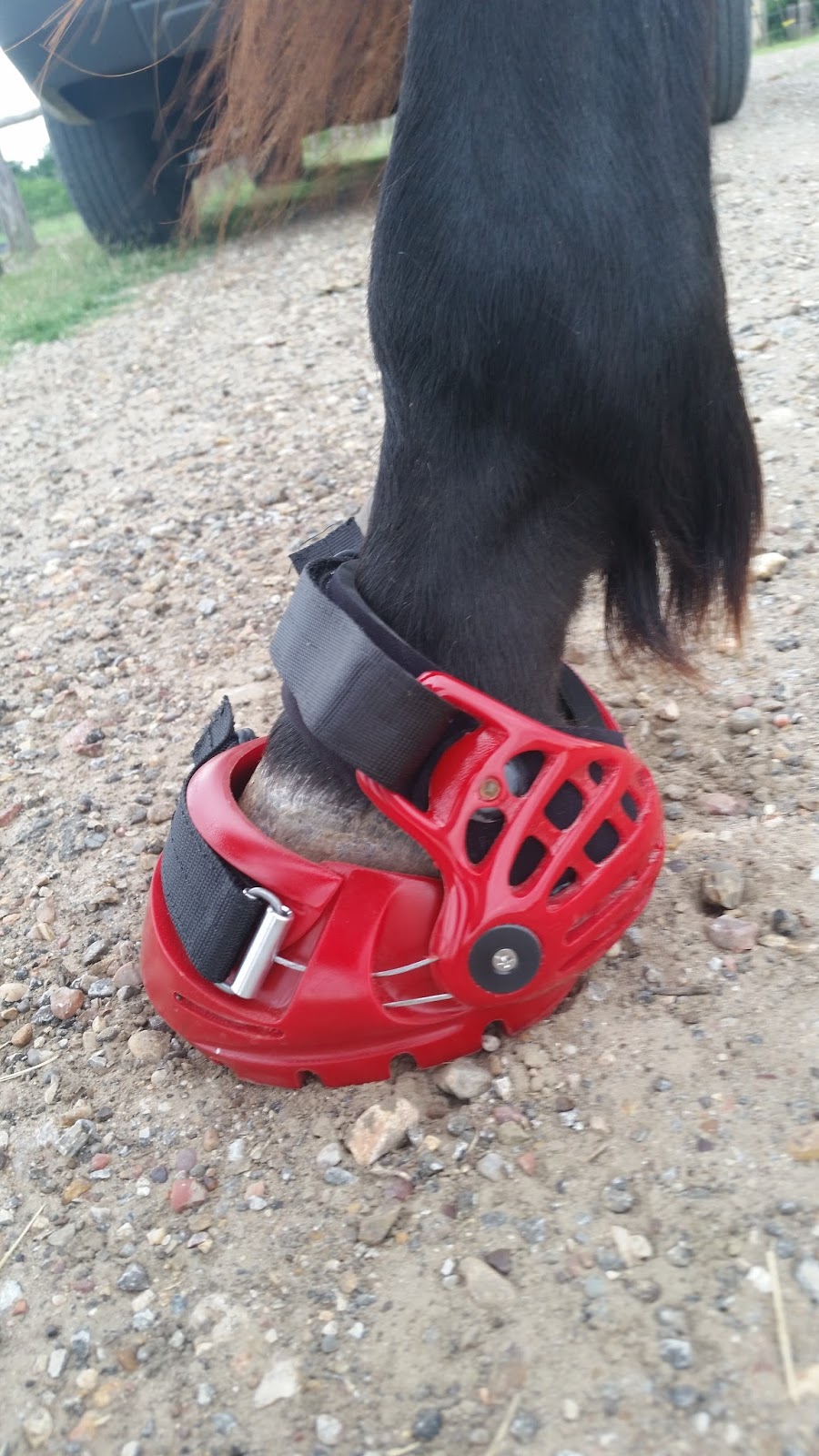 Grabbed Strider out of the field (he of course, once again had to remind me he is !INDEPENDENT! and ran off a few feet, then came back as I was loving on my Socks). Decided I'd see how the Hoof Armor was on his feet. I led him down the center aisle/road at the barn. There's gravel and some rocks. Nothing really intense, but he always Always ALWAYS asks to get off the road and into the grass. Yesterday, he just walked calmly beside me down the road. That's a good sign. I even made him walk over the few patches where there's a few rocks, and he just walked over them, no big deal.